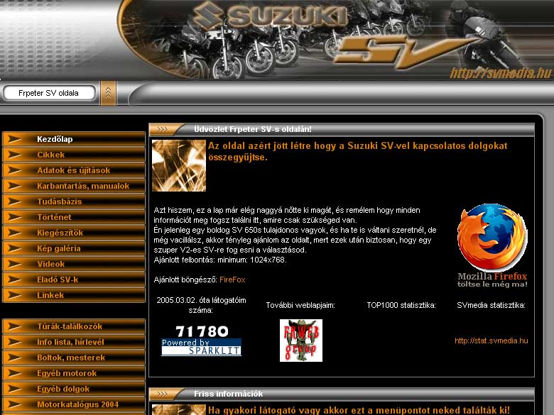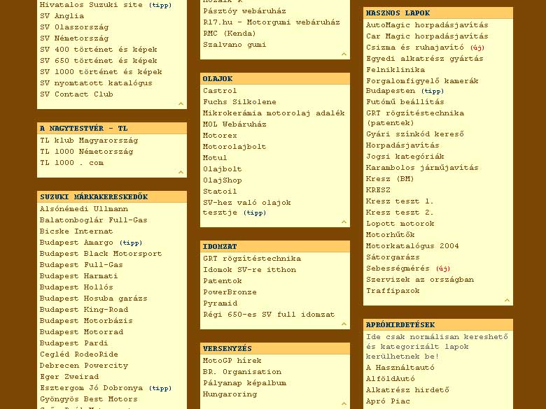 A suzukisv.lap.hu oldalon rendezetten, csoportokba gyüjtve találhatod meg az internet összes olyan linkjét, mely segítségedre lehet, ha bármilyen kérdés felmerül a motoroddal kapcsolatban.
