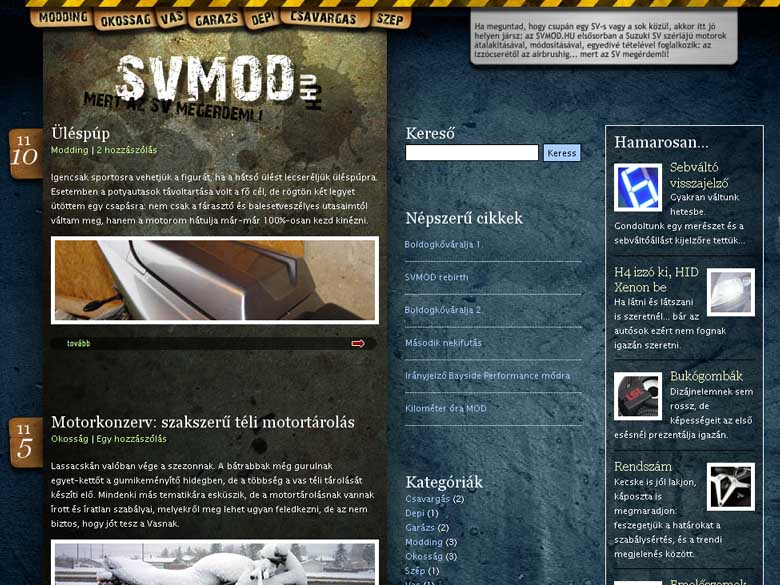 Az svmod.hu a Suzuki SV V2-es motorcsalád átalakításával, kiegészítésével, egyedivé tételével foglalkozik. Blogos formában, képekkel illusztrálva írja le a fentiekkel kapcsolatos történéseket, egyedi SV-ket mutat be, motoros túrákról ad beszámolót.